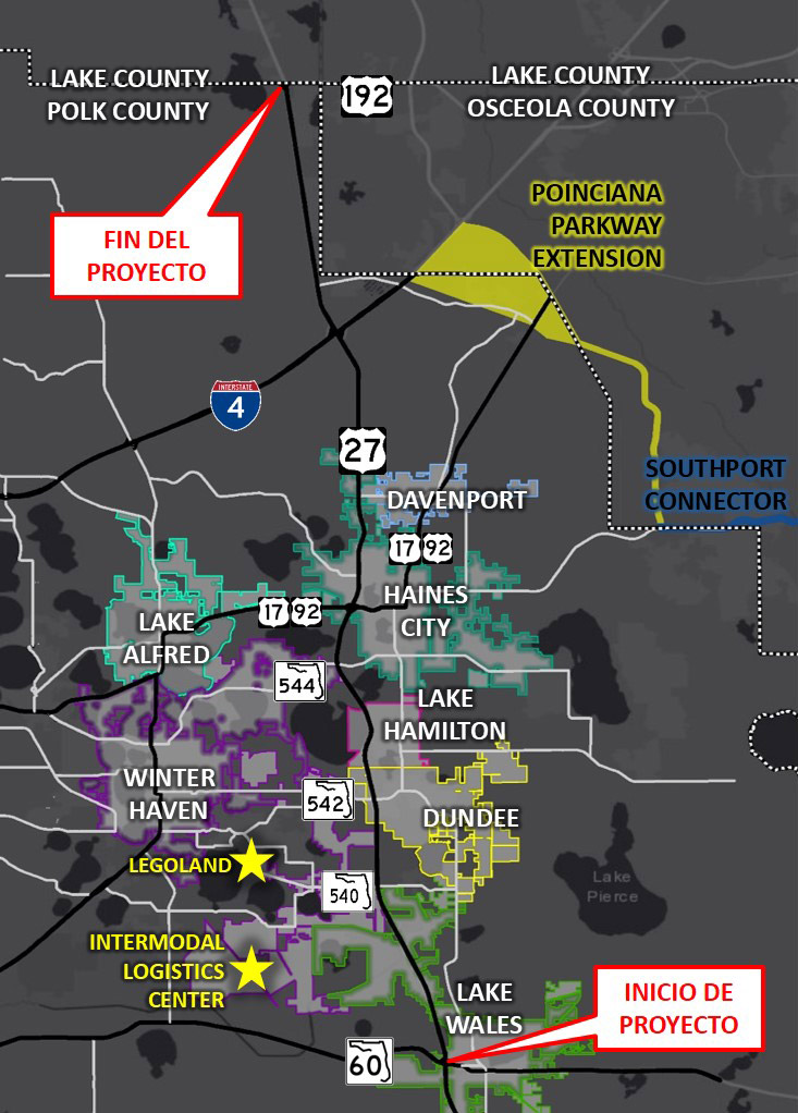 El área de estudio está ubicada en el condado de NE Polk, e incluye el corredor US 27 entre SR 60 y US 192 a la línea del condado de Polk / Lake. Siete municipios son adyacentes al corredor de estudio. A continuación se muestra un mapa del área de estudio.